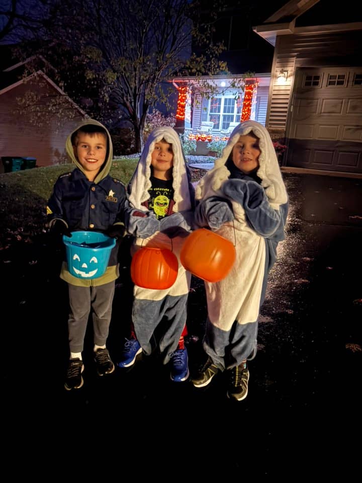Here is a photo of my little trick or treaters, 7yo twins and 9yo. All were going to be sharks but at the last minute, the 9yo decided to wear an old police officer costume. Btw this isn't in front of our house, just a nicely decorated house in the neighborhood.