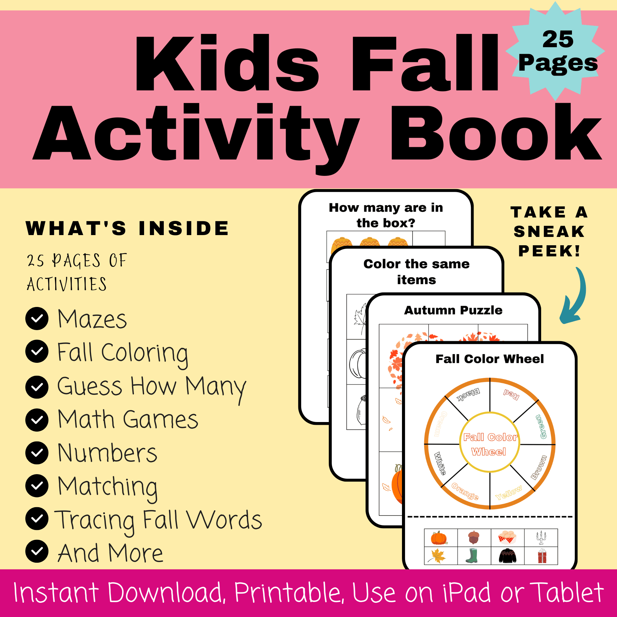 25 pages of activities including mazes, coloring, math games, numbers, matching, tracing fall words, guess how many, and more!